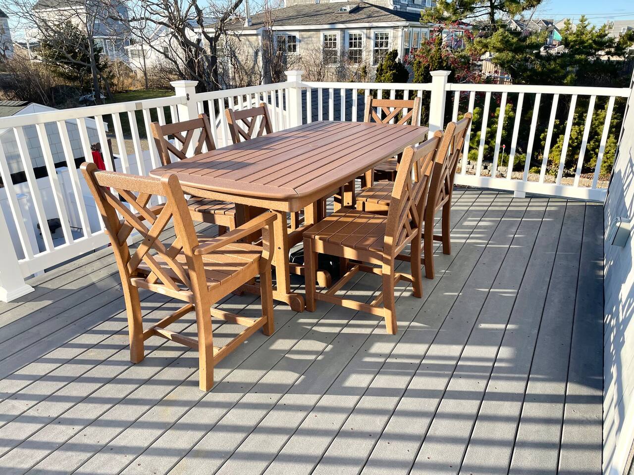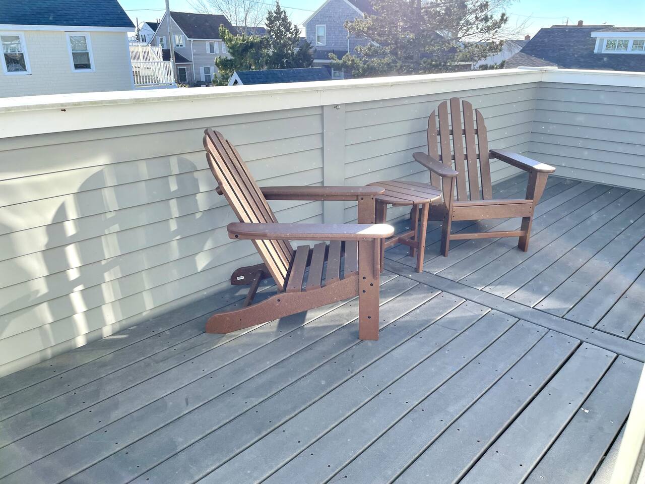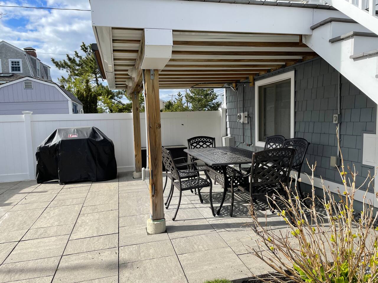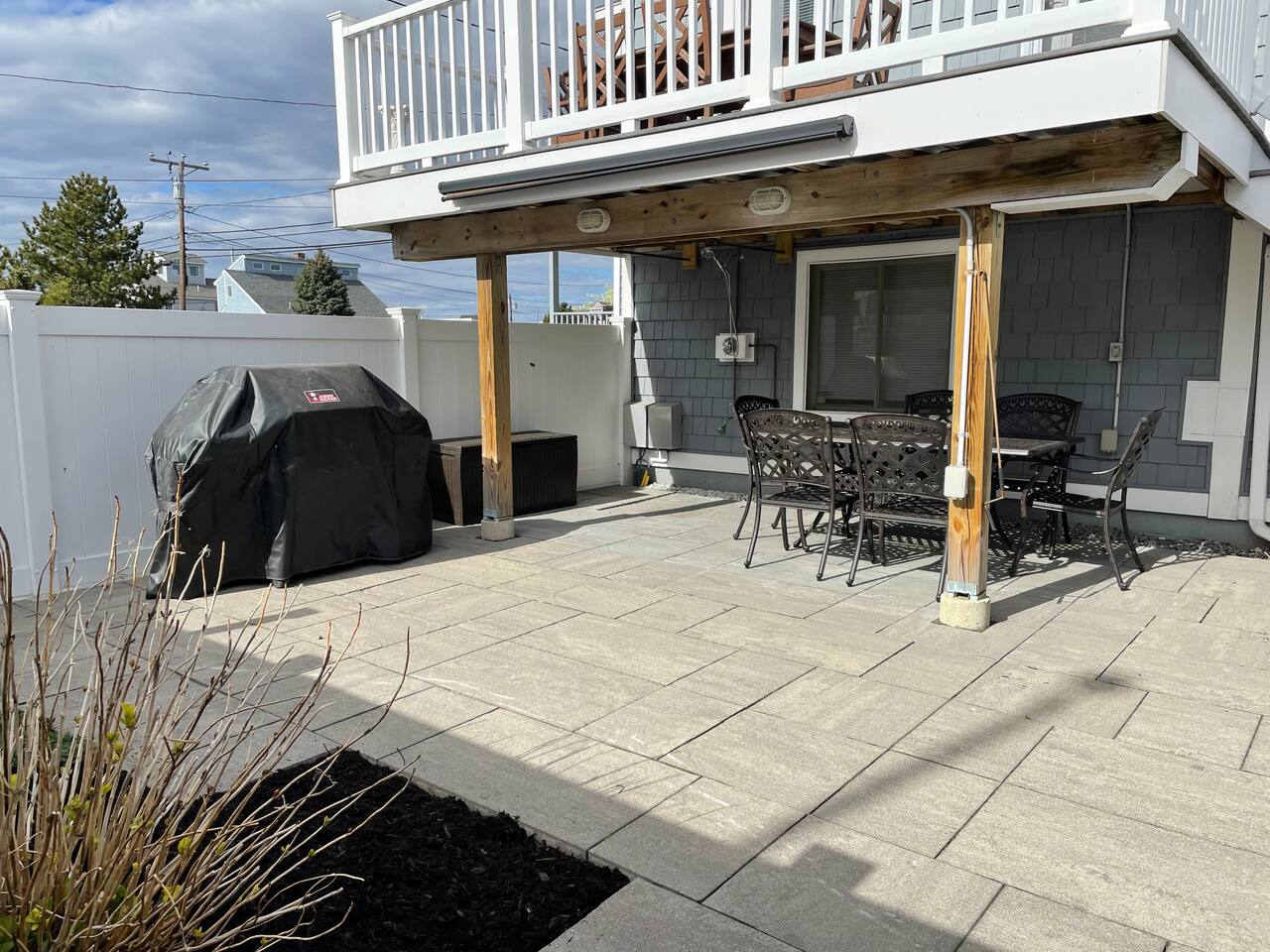 This condo complex includes two townhouse units that are attached. You will be renting this entire building! Each unit has a separate entrance, driveway, yard, and porches but you can easily walk from one side to the other. The outdoor space here is truly special, with multiple decks and patios where you can enjoy meals, sunbathe, or unwind with family and friends. We’ve also provided plenty of beach gear including bikes, sand toys, and chairs, so you’re all set for fun in the sun. And when it’s time for a cookout, you’ll find BBQ grills ready for your use! With parking for up to 7 cars (across 2 driveways), everyone can easily get to the property, and the beach is just a short walk away (about 100 steps). Whether you’re here to relax, explore, or enjoy the beautiful beach, this duplex offers everything you need for an unforgettable stay. UNIT A FEATURES: This spacious, fully updated 3-bedroom townhouse sleeps 8 and offers plenty of room for everyone to relax. The open layout, modern furnishings, and sun-filled rooms make it a perfect place to unwind after a day at the beach. Level 1: Living room and full bath Level 1.5: Kitchen Level 2: 2 bedrooms plus office area Lower Level: Bedroom and laundry Bedroom 1: Queen bed, attached bath, and step-down to office area with twin bed plus trundle and sliders to upper deck Bedroom 2: Queen bed with sliders to upper deck Bedroom 3 (lower level): Queen bed, attached to laundry room Outdoor - Driveway fits 5 cars - Large patio with full dining set in covered space and Adirondack chairs next to the shed - Large deck with another full dining set - Propane grill - Shed with beach gear and supplies - Upper deck with Adirondack chairs Other - Central heat and central air - Garage only fits very small car UNIT B FEATURES: **** Note: Photos for Unit 2 will be available May 15, 2025. ****** A cozy 2-bedroom townhouse that sleeps 4, featuring a new kitchen and all the comforts you need for a restful stay. It’s the perfect retreat for smaller families or a more intimate space to relax. Level 1: Dining room, kitchen, and full bath Level 2: Two bedrooms (queen and full bed), each with sliders to upper deck Lower level: living room and laundry room Other - Central Heat - Portable AC's OUTDOOR - Driveway fits 2 cars - Small patio with dinette set - Front Porch with swing - Upper deck with seating - Shed with beach gear and supplies BEDROOM SUMMARY BR1 - Queen Bed + twin daybed with twin trundle BR2 - Queen Bed BR3 - Queen Bed BR4 - Queen Bed BR5 - Full Bed
