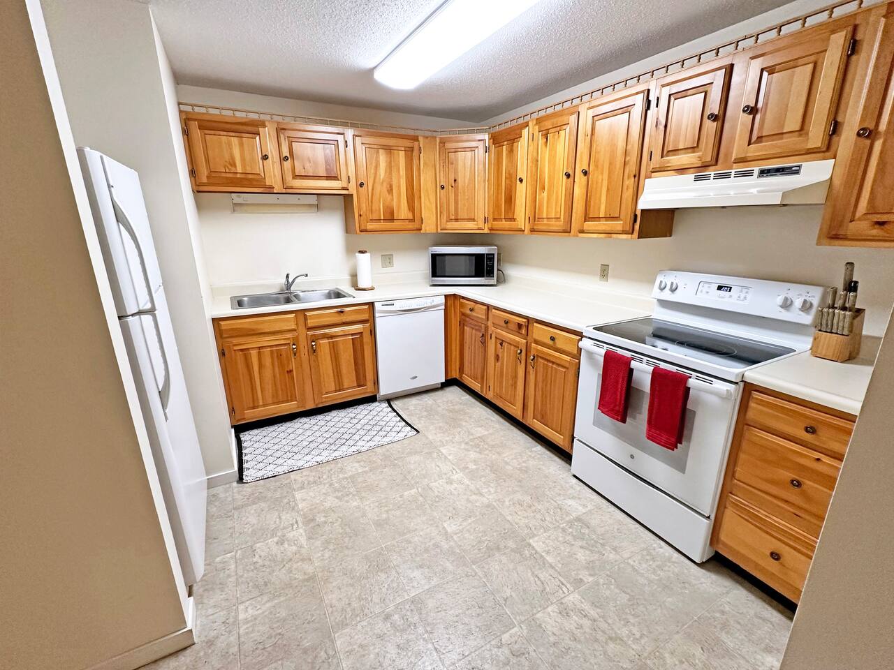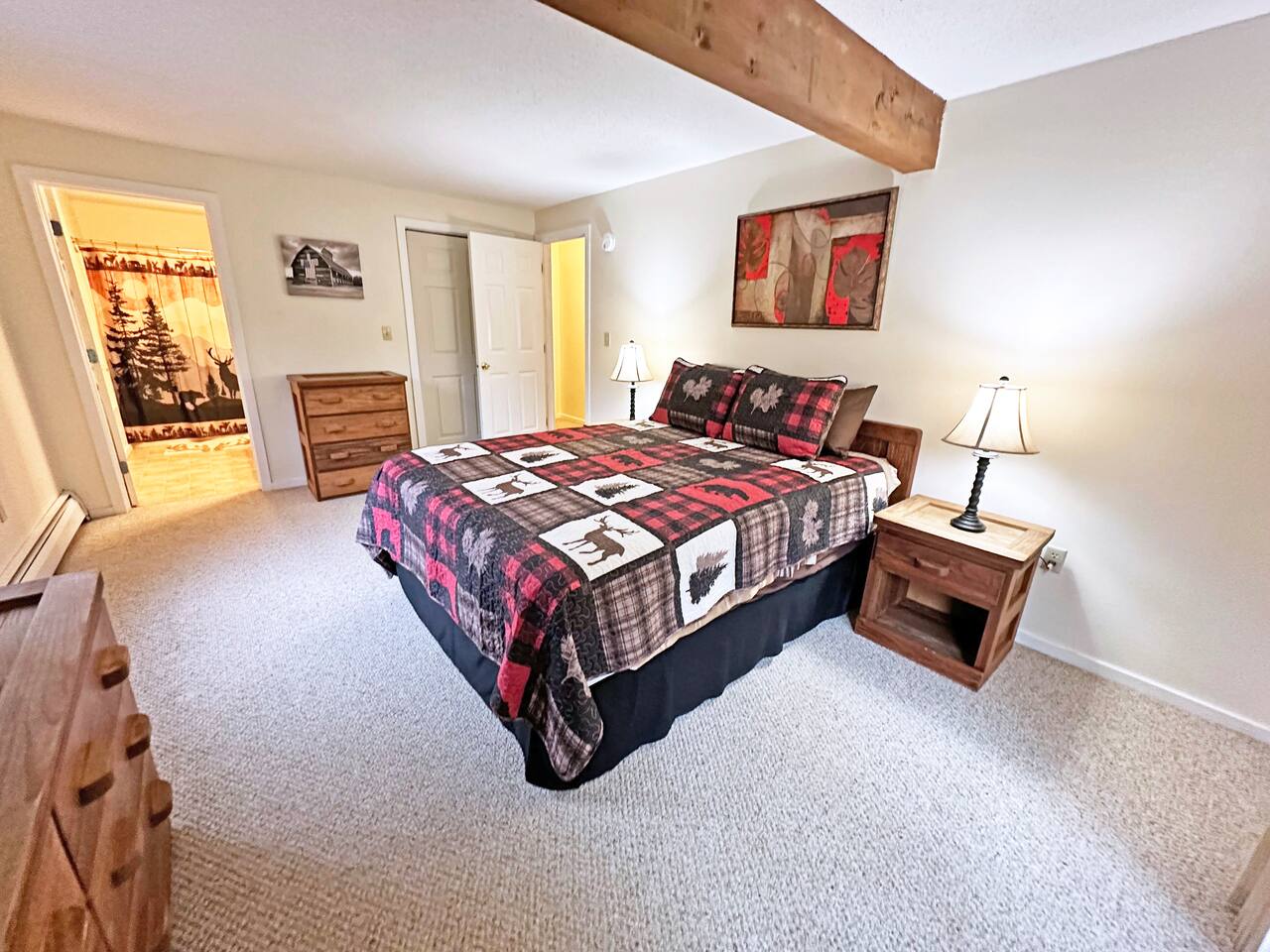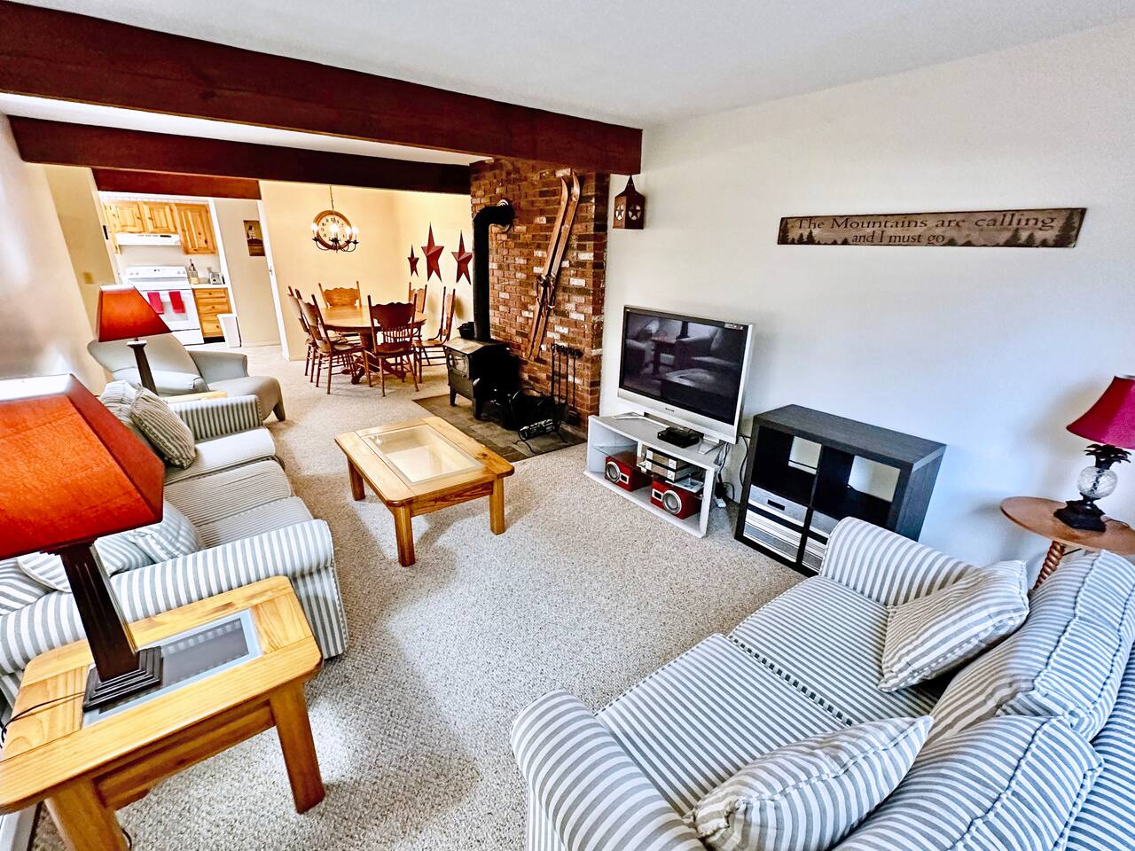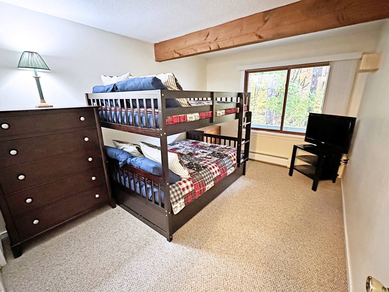 MAIN LIVING AREA This single-level garden-style condo features a combination living room and dining room space with multiple sofas, a full dining table and a pellet stove. The attached kitchen is equipped with all the basic necessities for cooking a meal at home. At the far end of the living room is a covered porch, great for enjoying your morning coffee. - Plenty of seating - TV - Pellet stove - Fully applianced kitchen - Drip coffeemaker MASTER BEDROOM The spacious master bedroom features a full bath, walk-in closet and sliders to the covered porch. There's plenty of room for a pack 'n play for your little one, which we also provide. - Queen bed - Night stands - Side table lamps - TV - Dressers - Walk-in Closet - Attached full bath SECOND BEDROOM The second bedroom is a great space for the kids. It includes two full mattresses and a slide-out twin trundle underneath the bottom bunk. - Full-over-full bunk bed - Twin trundle - Dresser - Closet - TV - Full bathroom off hallway OTHER IMPORTANT DETAILS - LAUNDRY: Enjoy the convenience of in-unit laundry! A stackable laundry machine is provided free-of-charge. - PARKING: Parking is available for 2 cars and on a first-come- first-serve basis. The lot is directly outside of the building. BABY GEAR - Pack 'n Play - High-chair - Baby bath CONSUMABLE SUPPLIES PROVIDED - Paper Towels - Toilet Paper - Shampoo - Conditioner - Body Wash - Dish soap - Dish Sponge - Trash Bags - Dishwasher tablets - Laundry pods - Starter drip coffee packs - Sugar - Non-dairy creamer COMMUNITY AMENITIES Please refer to our welcome book for a map of the community. A pass is provided inside of the unit. Please note that a fee is charged for lost passes. - Fishing pond - Picnic area - Community fire pit - Ball field - Hot tub - Game room with arcade games, table tennis, and pool table - Indoor, heated pool - Fitness room - Tennis courts NEARBY ATTRACTIONS - Attitash Mountain (3 minutes) - Storyland (6 mins) - Diana's Baths (8 mins) - Jackson Falls (10 mins) - Black Mountain Ski Area (13 mins) - North Conway Village (13 mins) - North Conway Outlets (19 mins) - Cranmore Mountain (15 mins) And much, much more!