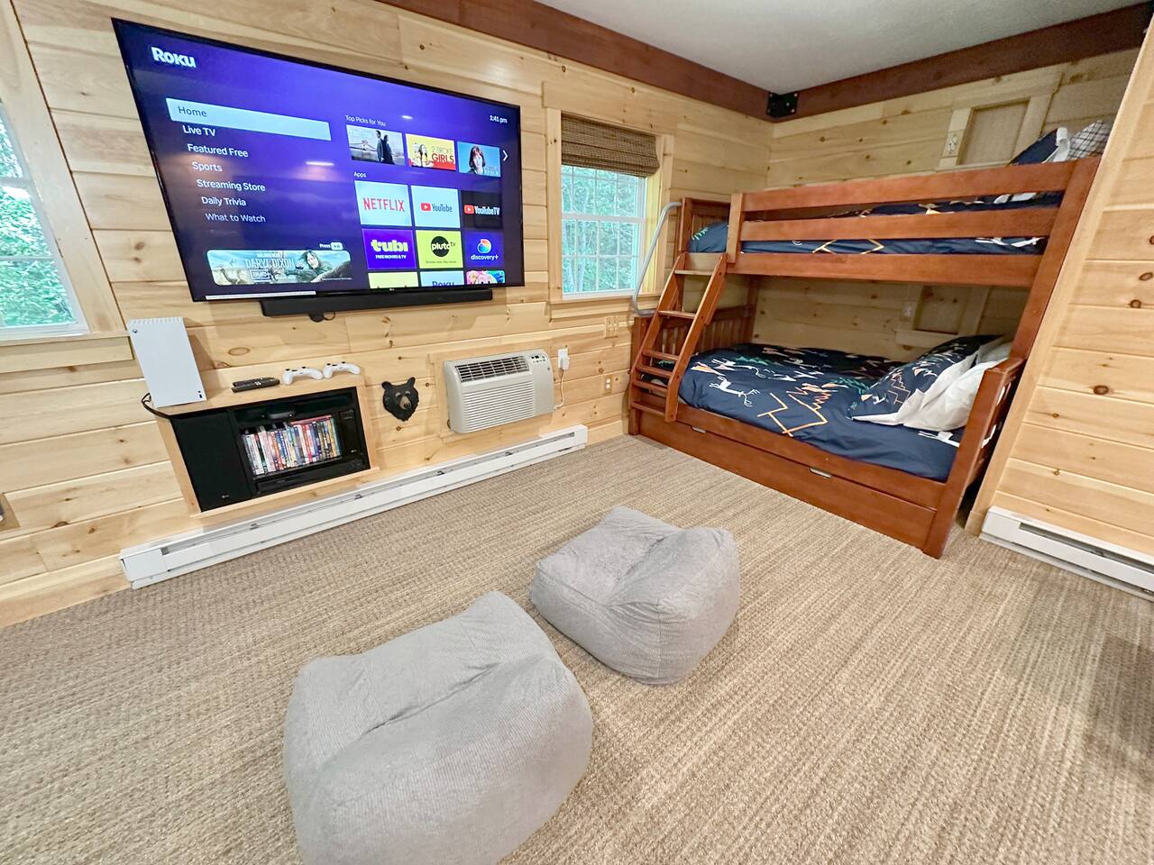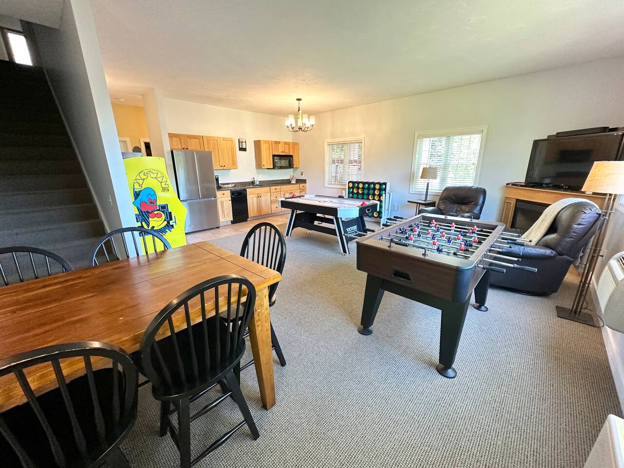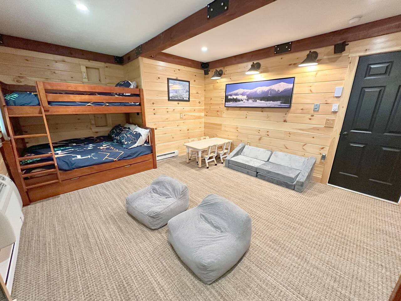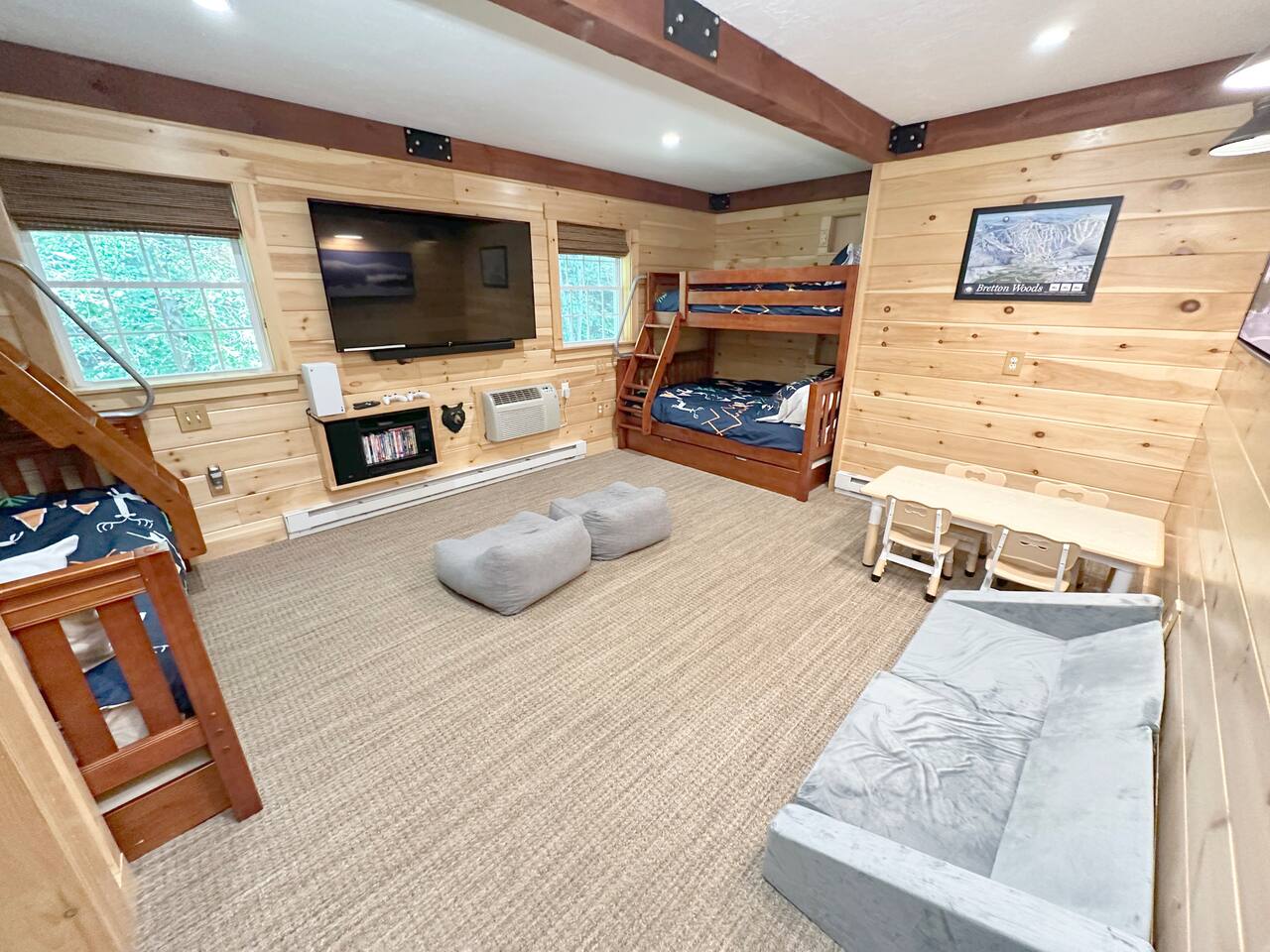 This spacious home is great for extended families and is full of amenities for an amazing stay! HIGHLIGHTS - Views of Stanton Mountain - Bedrooms with fireplaces, sitting areas, TV's and AC - Almost all bedrooms have private bathrooms - Two driveways with plenty of parking - Three different gaming areas - Gas fireplaces throughout - Wall AC units in each room - Outdoor fire pit with Adirondack chairs - Walk to Attitash ski lifts - Access to Attitash Sports Club amenities - Extensive outdoor seating - 6 person hot tub (starting early October) BEDROOMS BR1 (1st flr) - King Bed with private bath, fireplace with sitting area, TV, wall AC, sliders to deck with mountain views BR2 (1st flr) - 2 twin over full bunk beds plus 2 twin trundles, kids' play area with fort-building sofa, TV, Xbox, and board games BR3 (2nd flr) - King bed, twin bed with trundle, full crib, private bath, soaking tub, fireplace, and sofa BR4 (2nd flr) - King bed, private bath, fireplace and sitting area BR5 (lower level) - King bed, private bath, sitting area, sliders to lower deck with mountain views LIVING LEVELS 1st Flr - BR1 with bath and BR2 - Kitchen with island and bar stools - Large dining table and chairs - Living room with fireplace and mountain views - Mudroom - Decks 2nd Flr - BR3 with bath & BR4 with bath - Game room with pool table (separate stairs from bedrooms) Lower Level - BR5 with bath - Extra full bath - Kitchenette - Game room with fireplace, sitting area, arcade games, foosball, and air hockey - Exit to lower driveway - Covered deck - Hot tub (starting early October) OUTDOOR - Two driveways for parking - Large deck with multiple dining tables and chairs - Covered seating area with sofa - Covered gas grill area - Fire pit with Adirondack chairs xSTR DETAILS & SUPPLIES We go the xSTR mile to make your stay easy and memorable. We provide: - Bedding: Bed Linens, bath towels, and hot tub/pool towels - Toiletries: shampoo, conditioner, body wash, and cotton swabs in each bathroom - Kitchen supplies: pots & pans, dinnerware, bakeware, plasticware for children, toaster, blender, waffle maker, dual coffee maker (k-cup & drip), glassware, food storage containers, wine glasses, and more! - Paper goods: paper towels, toilet paper, dishwasher tablets, laundry pods, and trash bags - Coffee/Tea: Starter supplies for coffee and tea. SPORTS CLUB AMENITIES All renters will have access to Attitash Sports Club amenities including indoor/outdoor pools, indoor/outdoor hot tubs, tennis courts, playgrounds, private walking trails to small beaches along the Saco, game rooms, fitness rooms, and more. Access is free for our guests. A keycard is provided at the property. Lost keycards are subject to a $25 replacement fee. Please review the welcome book for additional information. - Indoor & Outdoor Pools - Indoor & Outdoor Hot Tubs - Saunas - Tennis Courts (clay and hard surface) - Walking Trails - Beaches along the Saco River - Fitness Rooms - Game Rooms