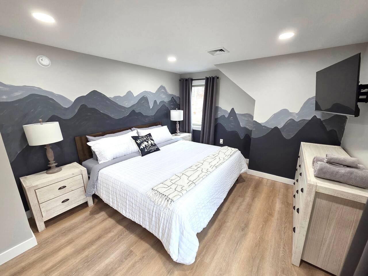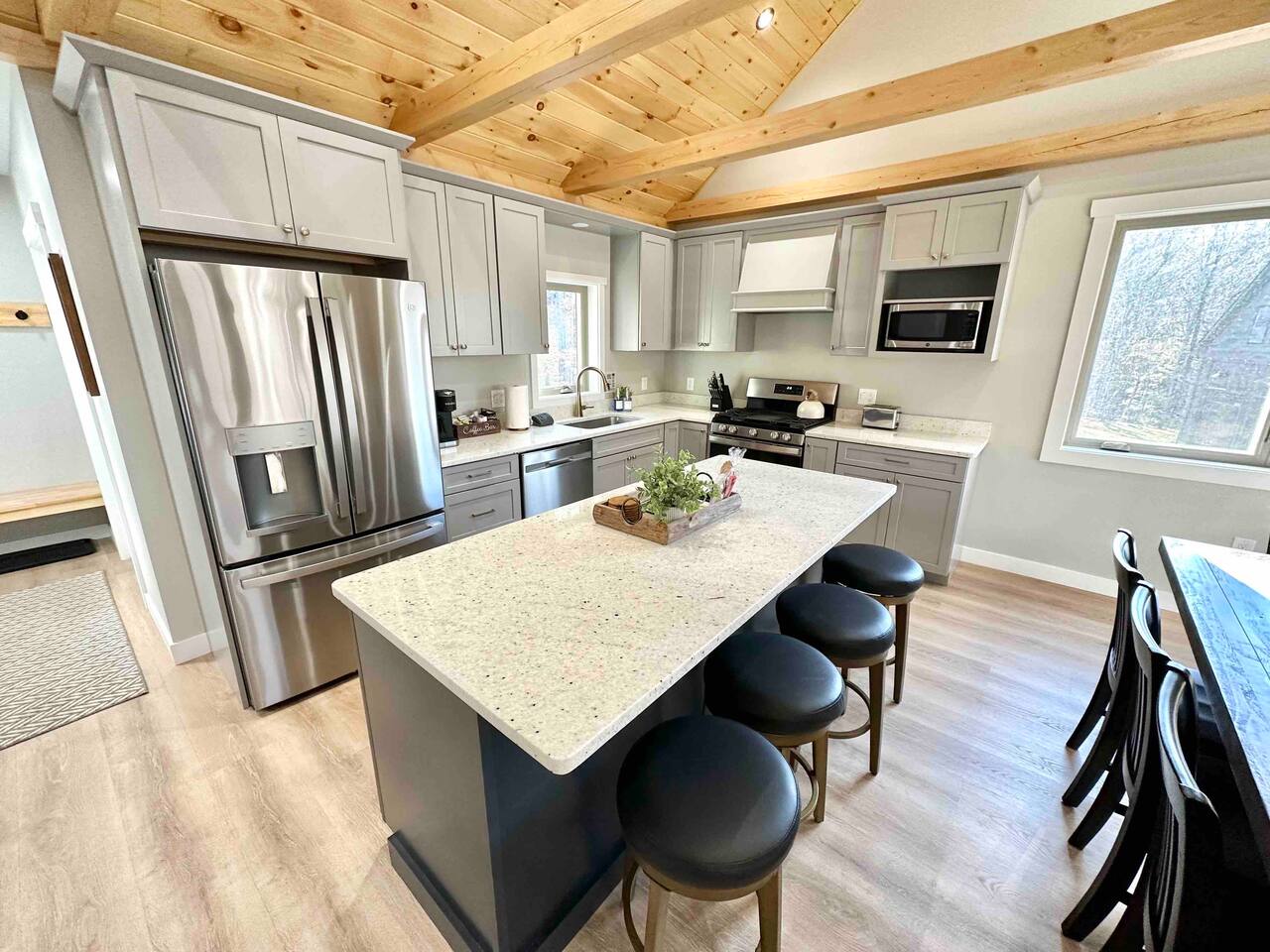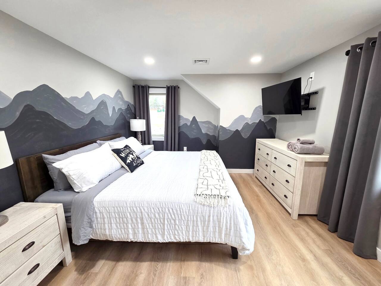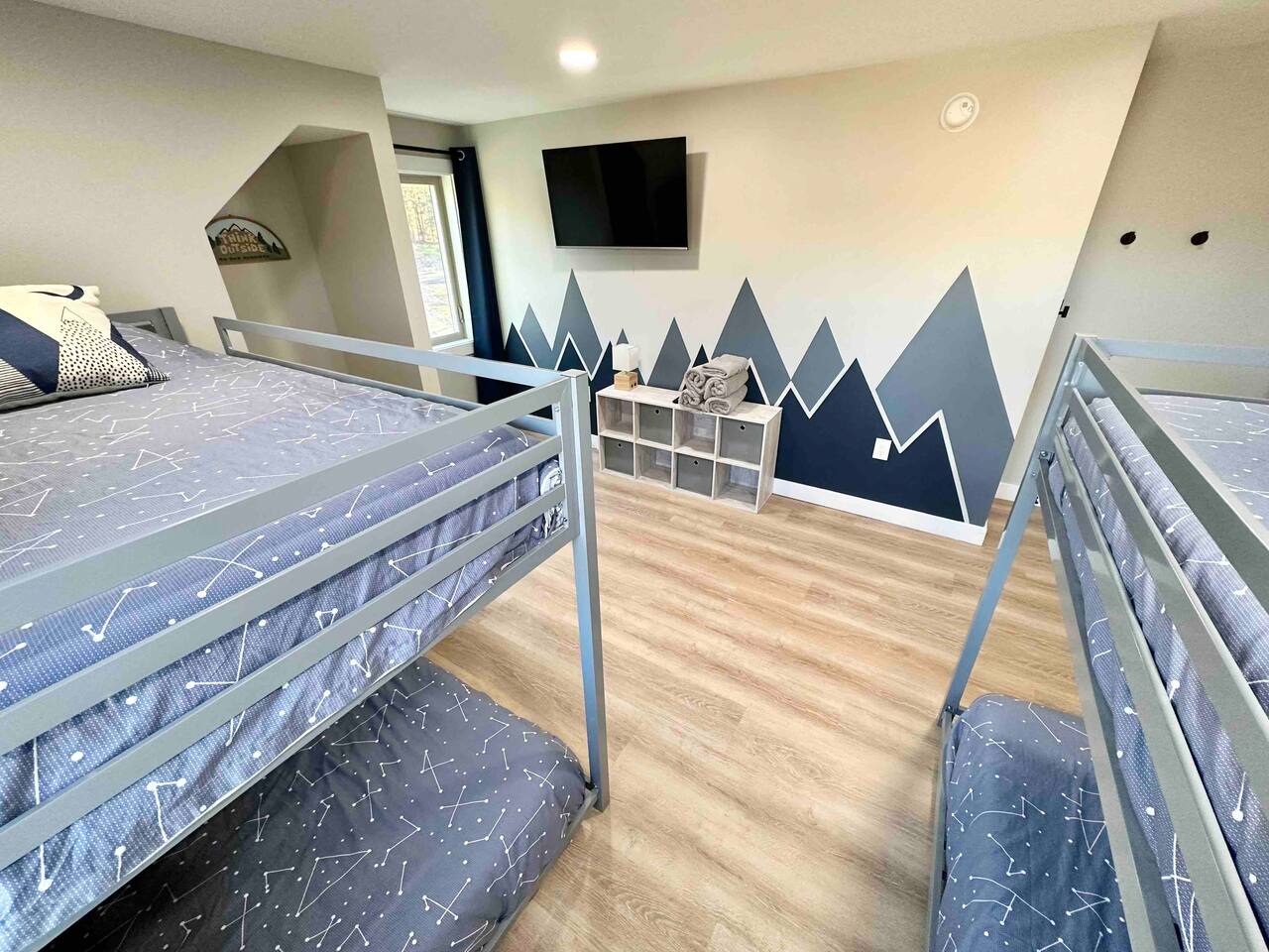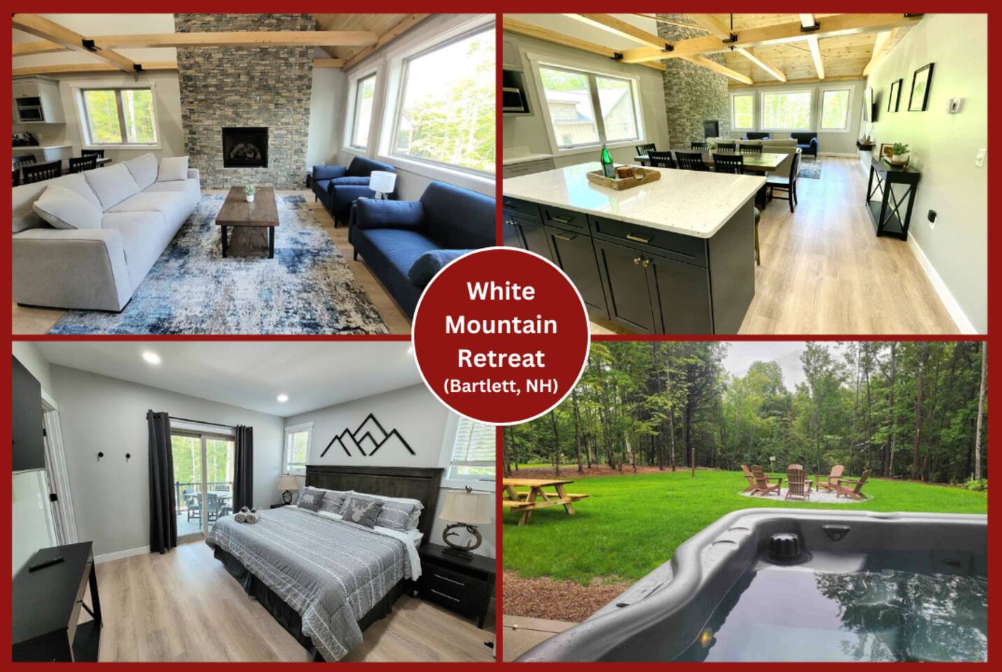 Step into this newly constructed home and find yourself transported into vacation mode instantly. It's flooded with natural light and designed with a touch of mountain charm. High ceilings, rustic details, and minimalist finishes give you the mental space you need to relax and restore. A large living room window frames a stunning mountain view that changes as the sun moves across the sky. This four bedroom White Mountain Retreat is ideal for large families or groups —providing places to hang together and unwind apart. The location is a paradise for adventurers: It is right next to Attitash and steps away from some of the area’s most peaceful and scenic hiking trails. Renters have access to the Attitash Sports Club, which includes a fitness center, indoor/outdoor pools and hot tubs, tennis courts, playgrounds, beach trails, and more! Plus, Storyland and North Conway Village are right up the street, making this luxury property a welcome home base for a truly memorable getaway. Featured Highlights * Access to Attitash Sports Club * Gas Fireplace * Hot Tub * Covered Porch with Seating * Fire Pit * Mountain Views * Playroom/Gameroom * Short Distance to Multiple Ski Resorts * 5 minutes to Storyland * Next door to Attitash MAIN FLOOR The first floor features a captivating great room, where the kitchen, dining area, and living room are united under the striking vaulted ceilings. This expansive space is ideal for groups to gather for shared meals and cherished moments. The dining area comfortably accommodates 8 at the table, with an additional 4 seats available on the island. In the living room, a couch centers around the stone fireplace that stretches to the ceiling, inviting guests to curl up for cozy afternoons or evenings after a day spent in the outdoors. It can also serve as the focal point for group gatherings and game nights. BEDROOMS 1st Floor Primary Bedroom | 1 king bed with en suite bath, walk-in closet, and walk-out to covered porch 2nd Floor Bedroom 1 | 1 queen bed, shared bathroom 2nd Floor Bedroom 2 | 2 sets of bunkbeds with 4 twin mattresses total, shared bathroom Lower Level Bedroom | 2 full beds and en suite bath with shower LOWER LEVEL On the lower level, discover a dedicated kids’ playroom, which is a fun hideaway for kids. Additionally, a spacious family room awaits, complete with comfortable seating, a TV, air hockey table, an assortment of board games, and convenient access to the hot tub. This area is designed for both entertainment and relaxation, making it a great spot for family and friends to have fun together. PARKING & STORAGE – Parking for 2 cars in the garage and 3 cars in the driveway – Ski storage rack in garage AMENITIES Outdoor - Access to Attitash Sports Club - Large yard with mountain views - Hot tub on covered patio - Fire pit w/ Adirondack chairs - Picnic table - Covered porch w/ furniture - Gas grill - Corn hole set Indoor - Smart TVs in every bedroom - Variety of bed sizes including 1 king bed, 1 queen bed, 2 full beds and 4 twins (bunks) - Bunk bed room - Full kitchen - Dining area - Gas fireplace - Wireless internet - Remote workspace with door - Washer and dryer - Playroom/Game Room: Fort building cushions, air hockey, foosball, board games and more! xSTR DETAILS & SUPPLIES We go the xSTR mile to make your stay easy and memorable. We provide: - Bedding: Bed Linens, bath towels, and hot tub/pool towels - Toiletries: shampoo, conditioner, body wash, and cotton swabs in each bathroom - Kitchen supplies: pots & pans, dinnerware, bakeware, plasticware for children, toaster, blender, dual coffee maker (K-cup and drip), glassware, food storage containers, wine glasses, and more! - Paper goods: paper towels, toilet paper, dishwasher tablets, laundry pods, and trash bags - Coffee/Tea: A few starter supplies for coffee and tea. ATTITASH MOUNTAIN We're just a mile from Attitash Mountain. There's free parking at the base of the mountain and across the street, so you can park and walk to the slopes. If parking across the street, be sure to use the underground walkway to safely cross the road. There's overflow parking further down the street with a shuttle every 5-10 minutes. SPORTS CLUB AMENITIES All renters will have access to Attitash Sports Club amenities including indoor/outdoor pools, indoor/outdoor hot tubs, tennis courts, playgrounds, private walking trails to small beaches along the Saco, game rooms, fitness rooms, and more. Access is free for our guests. A keycard is provided at the property. Lost keycards are subject to a $25 replacement fee. Please review the welcome book for additional information. - Indoor & Outdoor Pools - Indoor & Outdoor Hot Tubs - Saunas - Tennis Courts (clay and hard surface) - Walking Trails - Beaches along the Saco River - Fitness Rooms - Game Rooms
