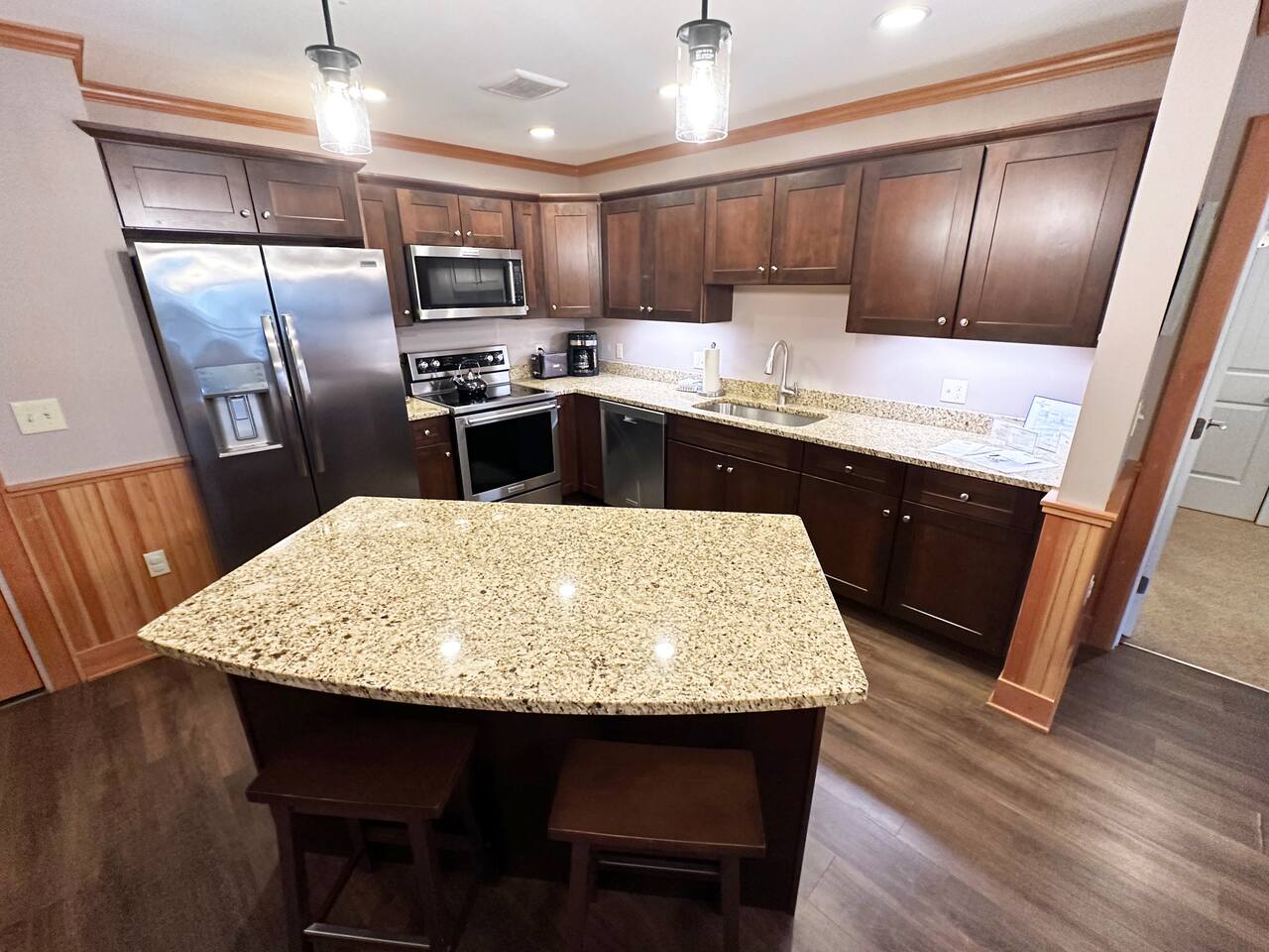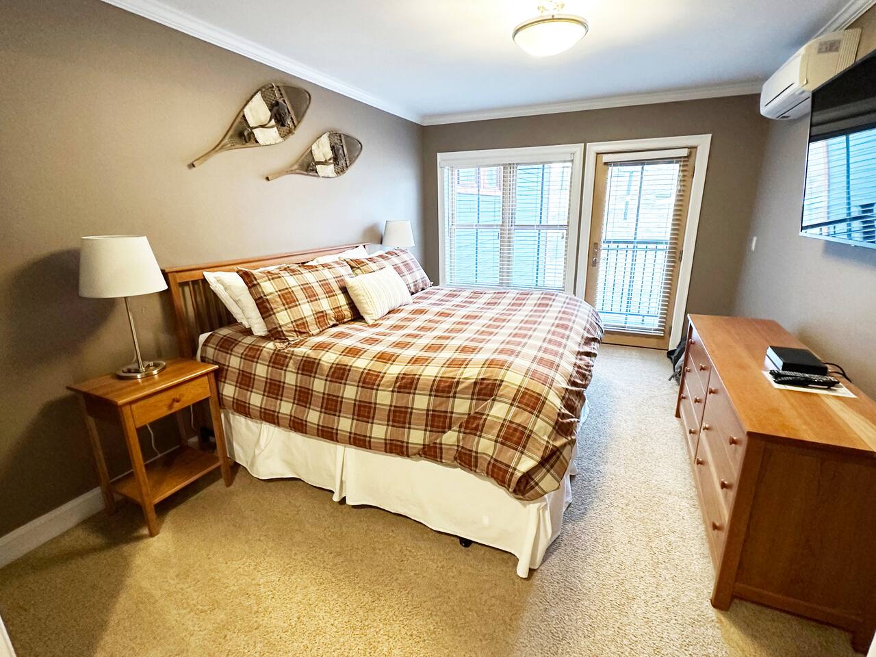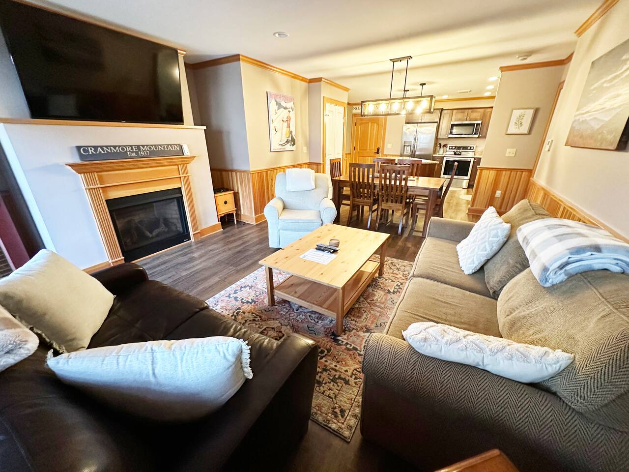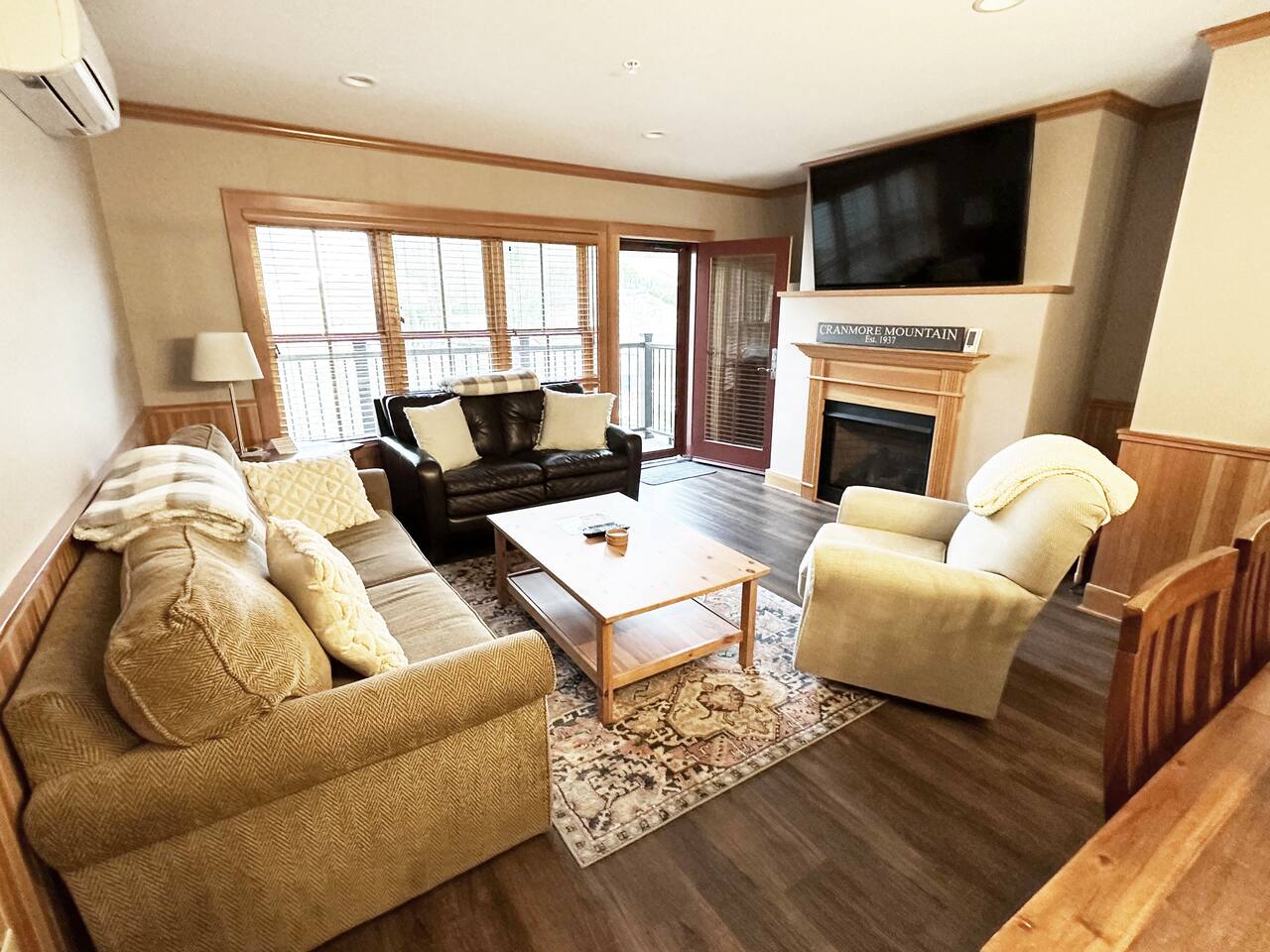 This cozy yet spacious 2-bedroom, 2.5-bathroom condo comfortably sleeps 4 guests, plus 2 more on a sofa bed. Enjoy the inviting mountain-style décor, warm up by the fireplace, and cook up a feast in the fully equipped kitchen with a large island. The washer/dryer in-unit adds convenience to your stay. After a day on the slopes, unwind with access to the resort’s heated pool, hot tub, and fitness room. Store your gear easily in the ski lockers on the first floor. A covered porch offers the perfect spot to relax and take in the breathtaking mountain views. Located just a short distance from downtown North Conway Village, you’re close to charming shops, restaurants, and year-round activities. The condo includes assigned parking for one car plus visitor parking for additional vehicles. Whether you're here for skiing, hiking, or simply relaxing in the mountains, this condo is the ultimate four-season getaway! LIVING AREA The open living area includes a living room with sleeper sofa, fireplace, and porch overlooking Cranmore Mountain. The dining table includes seating for 6. The fully-applianced kitchen features an island, fridge, range, microwave, and coffeemaker. A half bath and washer/dryer provide added convenience. MASTER BEDROOM The master bedroom suite includes a king-sized bed and large en suite bathroom with double sink and shower/tub combo. SECOND BEDROOM The second bedroom is setup as a mini suite with two twin beds, a small sink, full bath with tub/shower combo, and loveseat sitting area. COMMUNITY AMENITIES Ski Lockers - This building is ski-in/ski-out. Unload your gear from your car and store it in the ski lockers conveniently located on the first floor of the building. Located right at Cranmore Mountain, you can walk right over to the lifts. Gym - A fitness room is available with a variety of equipment including free weights, treadmills, and cycling machines. Pool - Enjoy a refreshing dip in the community pool or hot tub located just a short walk from the building. Parking - There is one dedicated parking spot for this unit and additional spaces available in the visitor parking area. Elevator - This building includes an elevator.