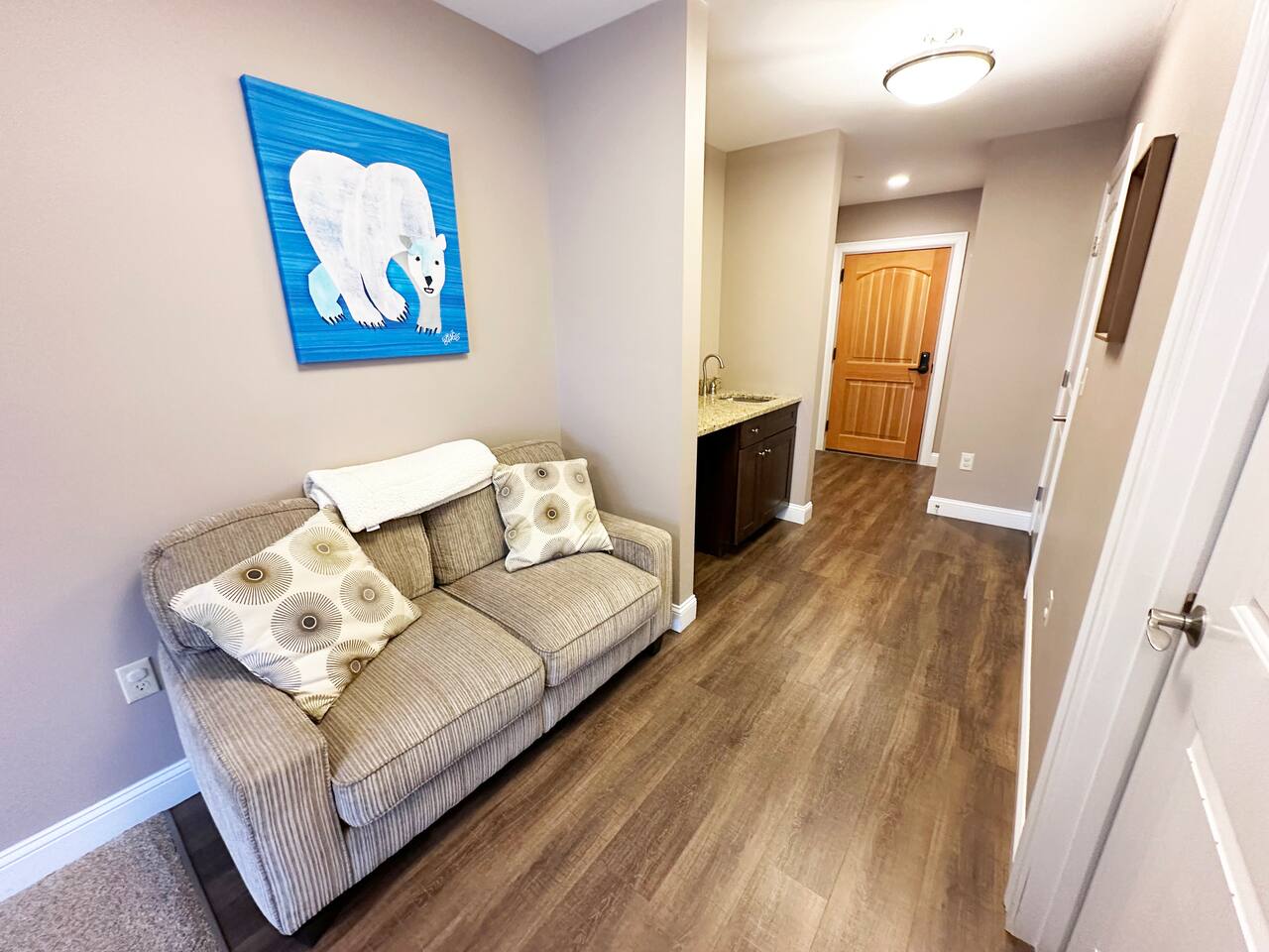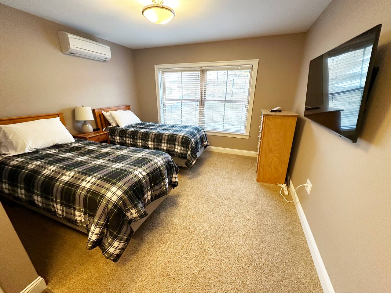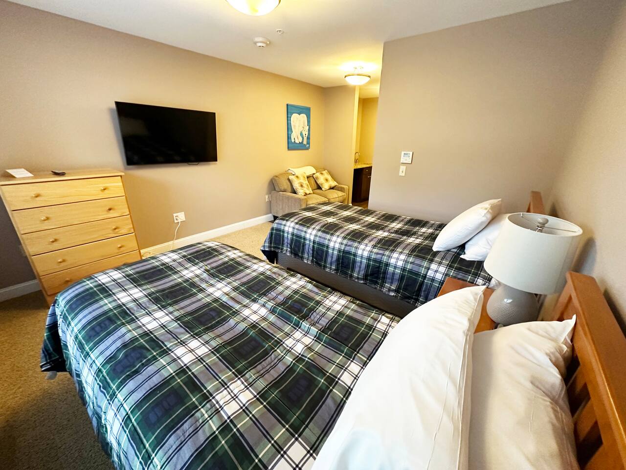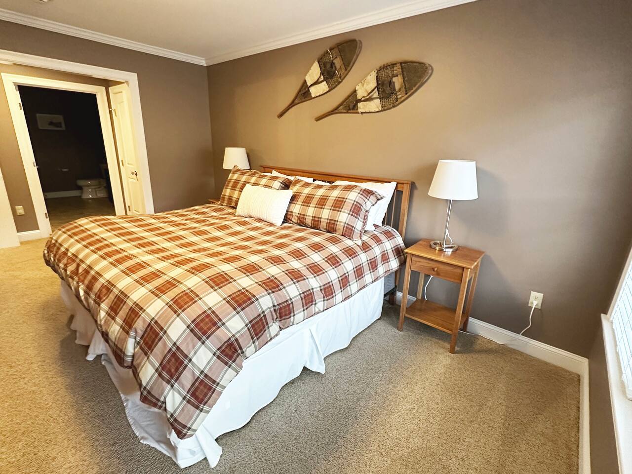 This cozy yet spacious 2-bedroom, 2.5-bathroom condo comfortably sleeps 4 guests, plus 2 more on a sofa bed. Enjoy the inviting mountain-style décor, warm up by the fireplace, and cook up a feast in the fully equipped kitchen with a large island. The washer/dryer in-unit adds convenience to your stay. After a day on the slopes, unwind with access to the resort’s heated pool, hot tub, and fitness room. Store your gear easily in the ski lockers on the first floor. A covered porch offers the perfect spot to relax and take in the breathtaking mountain views. Located just a short distance from downtown North Conway Village, you’re close to charming shops, restaurants, and year-round activities. The condo includes assigned parking for one car plus visitor parking for additional vehicles. Whether you're here for skiing, hiking, or simply relaxing in the mountains, this condo is the ultimate four-season getaway! LIVING AREA The open living area includes a living room with sleeper sofa, fireplace, and porch overlooking Cranmore Mountain. The dining table includes seating for 6. The fully-applianced kitchen features an island, fridge, range, microwave, and coffeemaker. A half bath and washer/dryer provide added convenience. MASTER BEDROOM The master bedroom suite includes a king-sized bed and large en suite bathroom with double sink and shower/tub combo. SECOND BEDROOM The second bedroom is setup as a mini suite with two twin beds, a small sink, full bath with tub/shower combo, and loveseat sitting area. COMMUNITY AMENITIES Ski Lockers - This building is ski-in/ski-out. Unload your gear from your car and store it in the ski lockers conveniently located on the first floor of the building. Located right at Cranmore Mountain, you can walk right over to the lifts. Gym - A fitness room is available with a variety of equipment including free weights, treadmills, and cycling machines. Pool - Enjoy a refreshing dip in the community pool or hot tub located just a short walk from the building. Parking - There is one dedicated parking spot for this unit and additional spaces available in the visitor parking area. Elevator - This building includes an elevator.