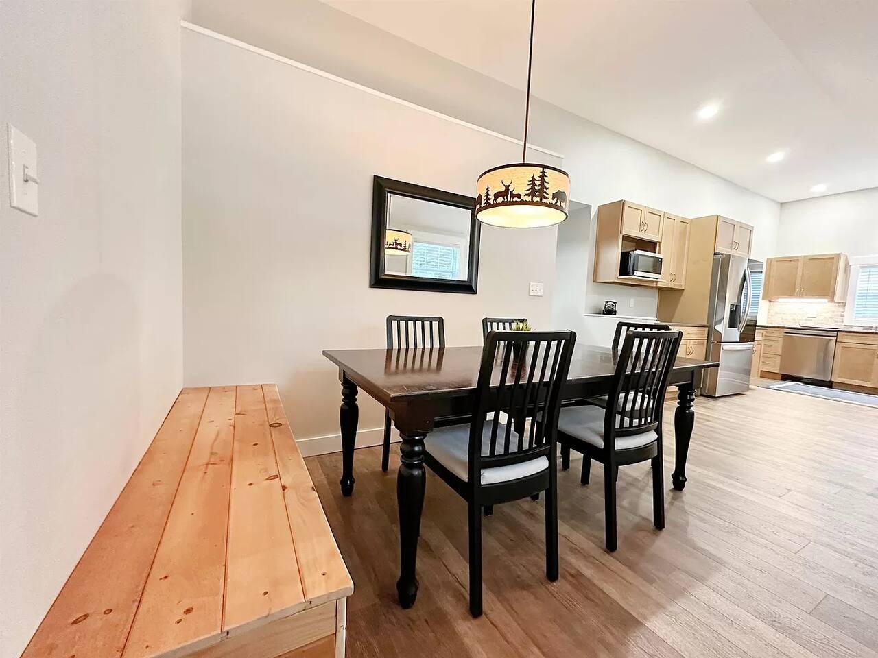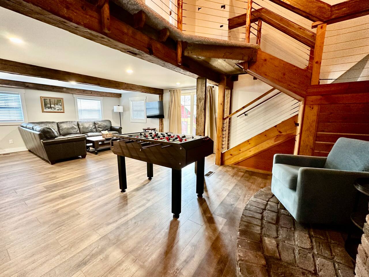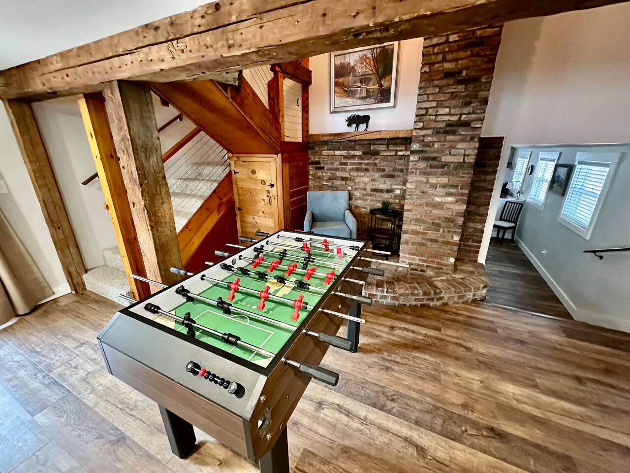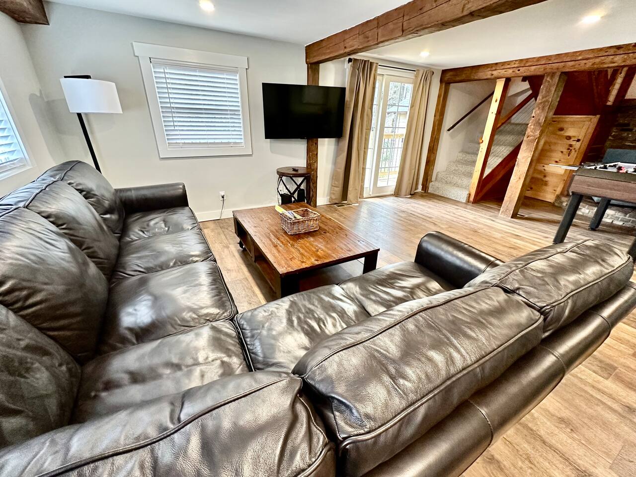 Located along the Kancamagus Highway in Conway, NH, The Almost There combines modern comfort with traditional charm. This delightful three-bedroom, two-and-a-half-bath retreat is located on multiple levels with plenty of spaces to both tuck away and gather together. Children will love the unique layout, which makes their own rooms feel like cozy nooks with slanted ceilings and three twin beds. Adults will appreciate the cottage’s interior highlights, such as the exposed brick and beams, which add a touch of rustic charm to the modern abode. The Kancamagus Highway is considered a national treasure and one of the best places in the world to watch the leaves change color in the fall, but really it is beautiful any time of year. The Almost There is situated right in the center of this notable area and provides a great home base as you explore ski resorts, state parks, rivers, hiking, biking, and walking trails, as well as charming downtown areas with shops and restaurants. MAIN LEVEL Leave your gear in the mudroom and enter the modern kitchen with high ceilings and modern amenities. You will also find a cute breakfast nook tucked under a window with two bar stools. The kitchen is attached to the dining area for easy meal prep and dining. The dining table is surrounded by bench seating, which the kids will love. On this level you will find the primary bedroom with ensuite bath and large laundry room. The primary bedroom offers ample space and a luxurious bath with double sinks. A few steps up, leads you to the large living room with additional sleeping and sitting areas. SECOND FLOOR The second floor has two bedrooms. The first bedroom has its own balcony. The second bedroom is a fun space for kids with slanted ceilings, built-ins, and three twin beds. BEDROOMS First Floor Primary Bedroom | 1 queen bed with en suite bath Second Floor Bedroom 2 - 1 queen bed Second Floor Bedroom 3 - 3 twin beds Extra Sleeping Area - Twin over full bunk beds off living room on First Floor PARKING & OUTDOOR – Parking for 3-4 cars in the driveway – Mudroom with space for summer and winter gear – Upper deck off second-floor bedroom INDOOR – Full eat-in kitchen – Breakfast nook with bar stools – TVs in living room, primary bedroom, and one second-floor bedroom – Washer and dryer on the first floor – Wireless internet – Foosball table