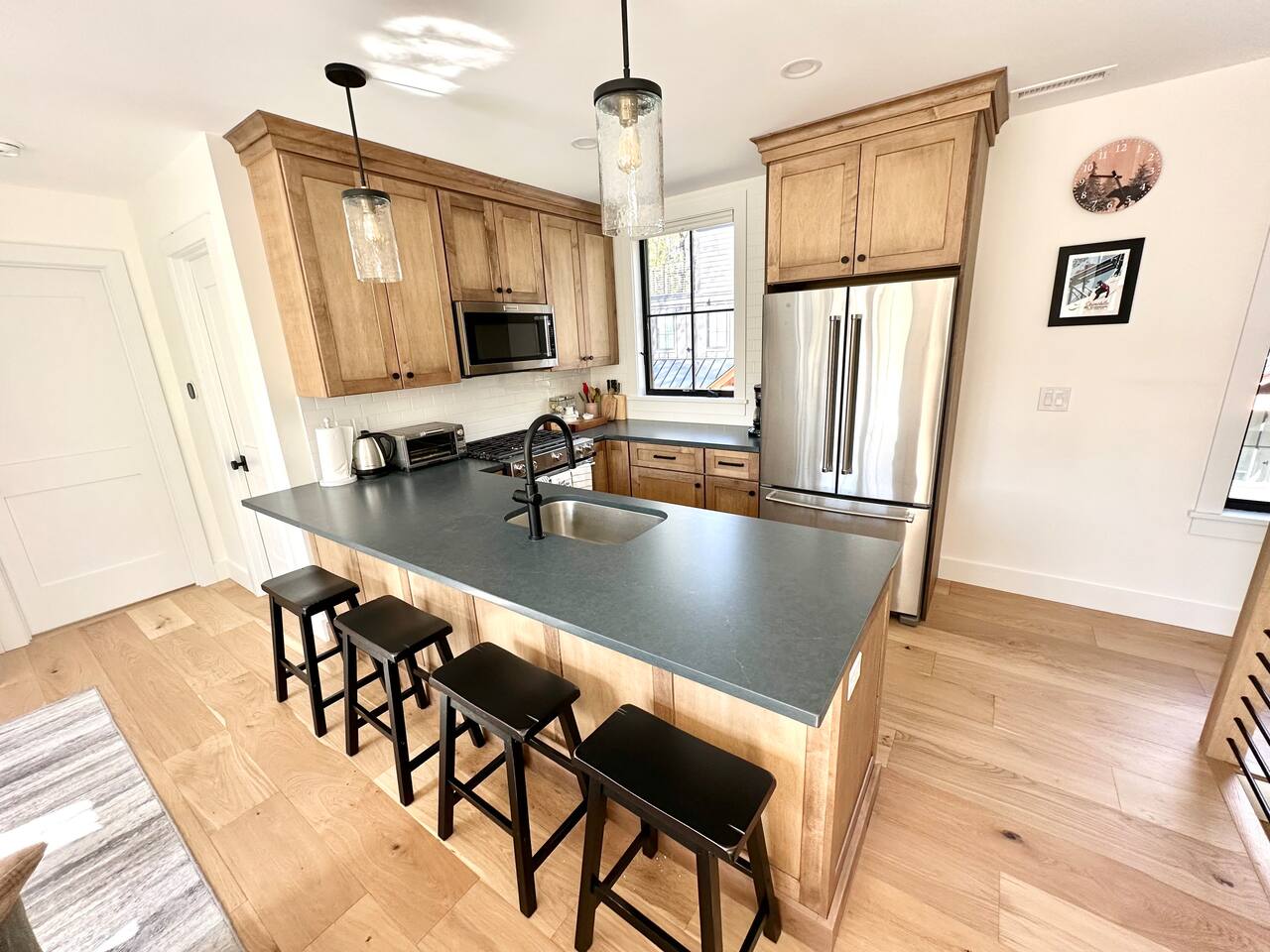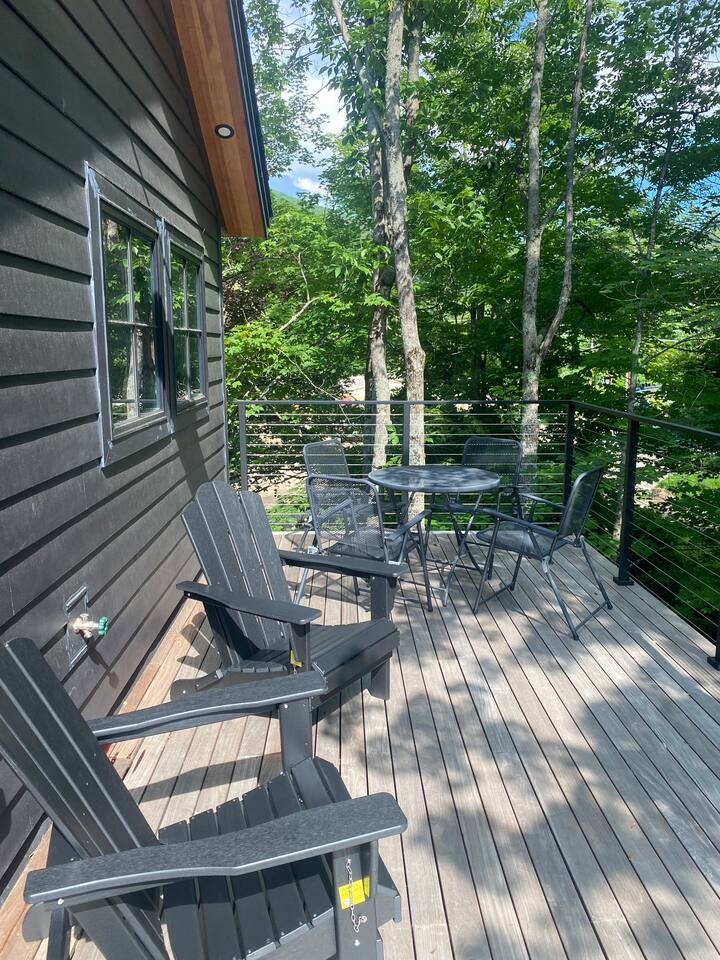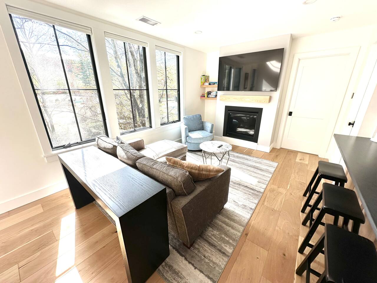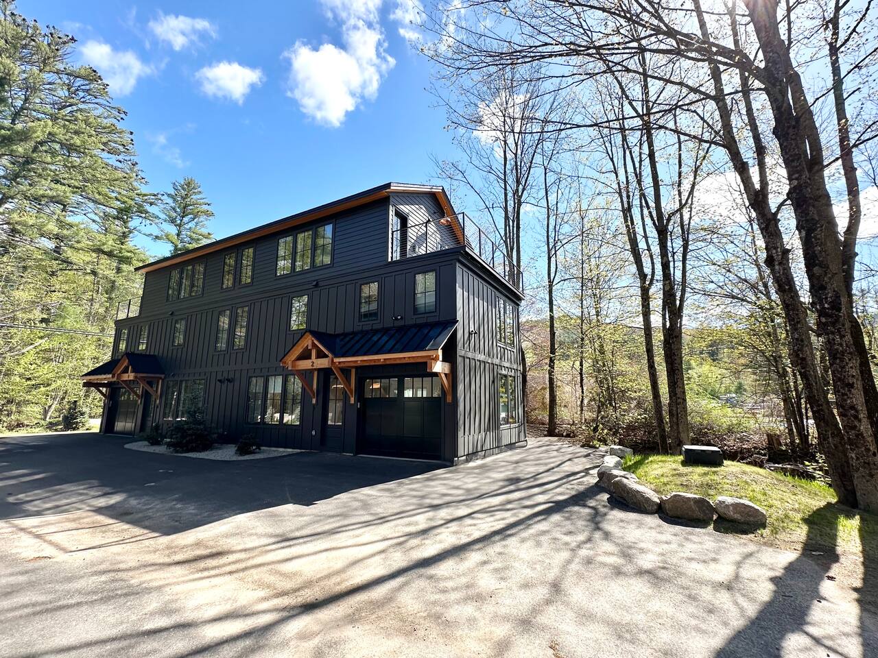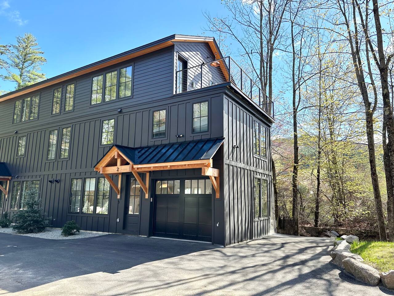 Discover the perfect blend of convenience and tranquility in this modern townhouse, steps from Cranmore Mountain and downtown North Conway. Enjoy year-round adventures from this new unit along a peaceful stream with 3 living levels, 3 bedrooms, 2 living rooms, and a sunlit kitchen. Take in the scenic views from the upper deck, and enjoy the convenience of garage parking. 1ST LEVEL - Garage - Mudroom - Family Room - Half bath 2ND LEVEL - Living room - Kitchen - Half bath - Master bedroom - Master bath with shower 3RD LEVEL - Two bedrooms - Full bath - Deck BEDROOMS - Master Bedroom: Queen bed with bath and walk-in closet - 2nd Bedroom: Two sets of twin bunk beds plus one trundle - 3rd Bedroom: Queen bed PARKING Parking is available for 3 cars maximum: 1 garage space for a sedan, 1 space on the side of the building, plus one additional space in front of the garage. STAIRS Please note that this is a multi-level townhouse so there are multiple stairs to climb. xSTR DETAILS & SUPPLIES - Bedding: Bed Linens and bath towels - Toiletries: shampoo, conditioner, body wash, and cotton swabs in each bathroom - Kitchen supplies: pots & pans, dinnerware, bakeware, plasticware for children, toaster, blender, coffee maker (drip coffee), glassware and more! - Paper goods: paper towels, toilet paper, dishwasher tablets, laundry pods, and trash bags - Coffee/Tea: A few starter supplies for coffee and tea.