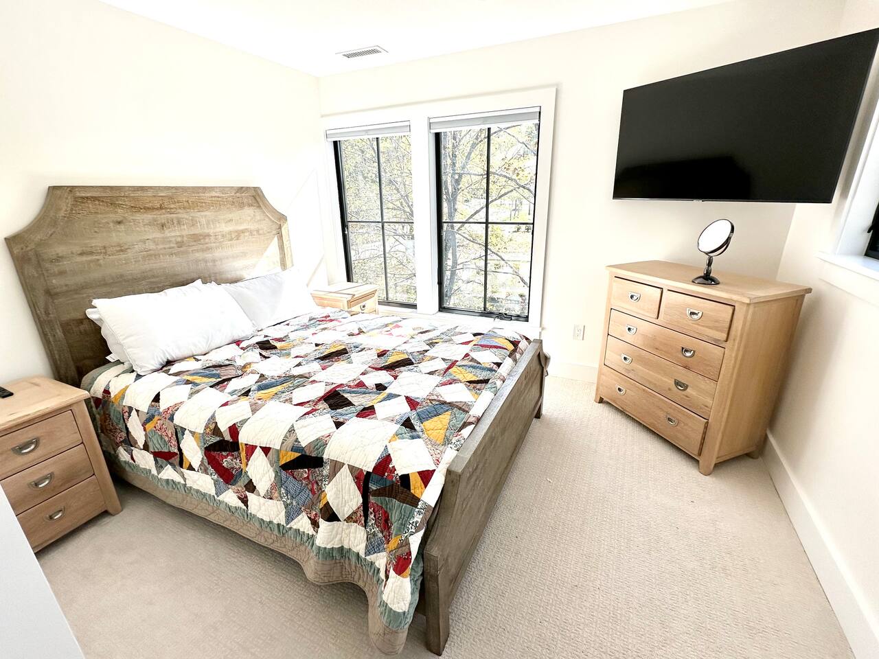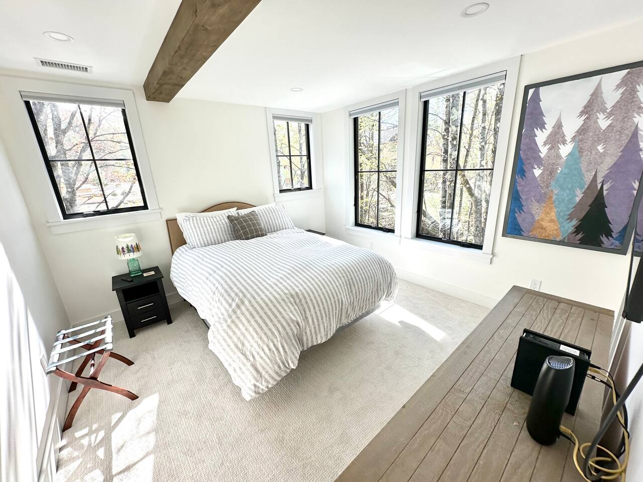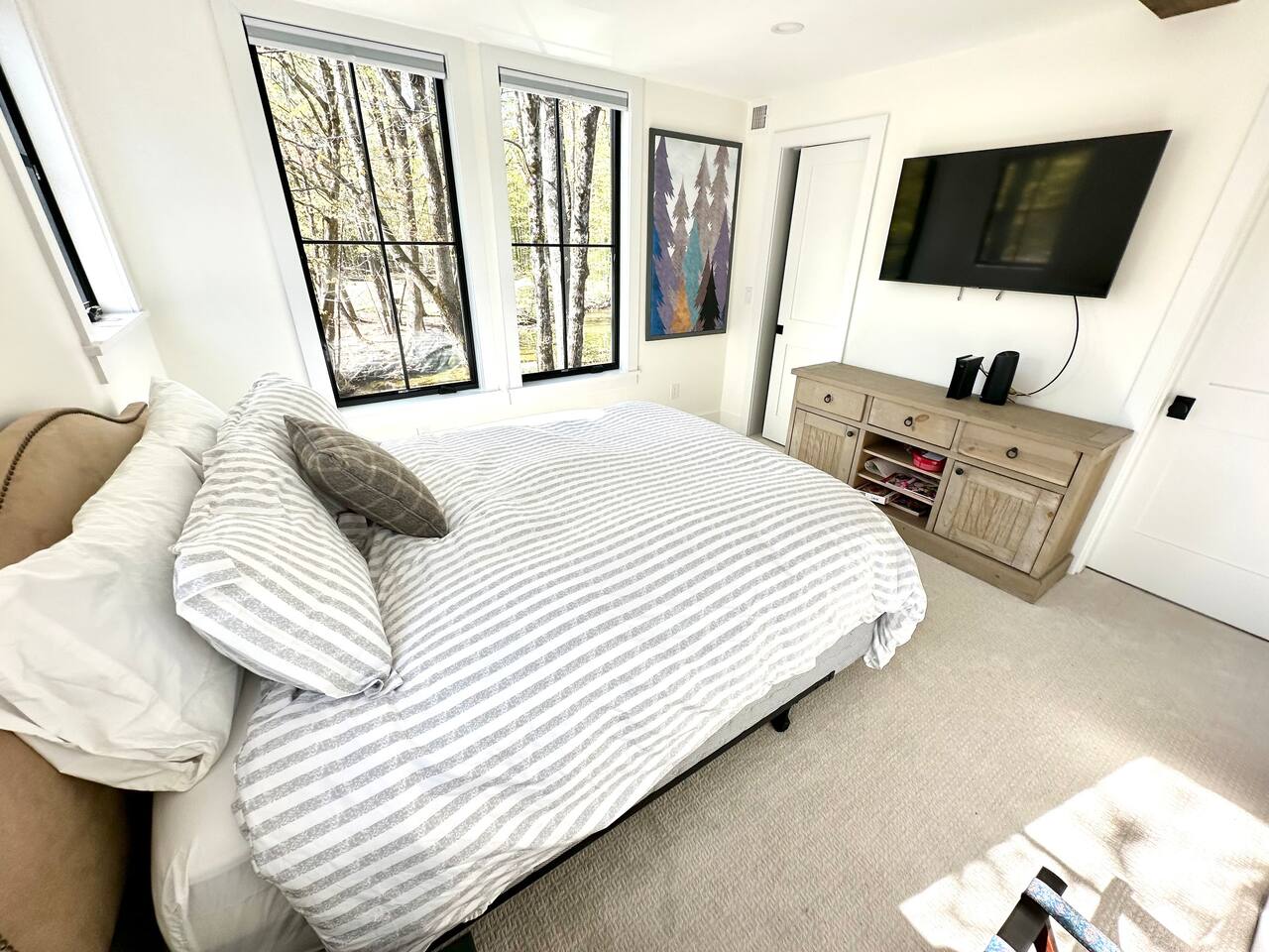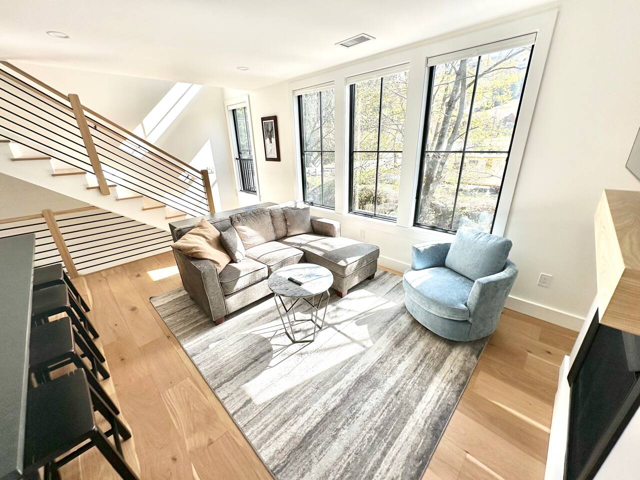 Discover the perfect blend of convenience and tranquility in this modern townhouse, steps from Cranmore Mountain and downtown North Conway. Enjoy year-round adventures from this new unit along a peaceful stream with 3 living levels, 3 bedrooms, 2 living rooms, and a sunlit kitchen. Take in the scenic views from the upper deck, and enjoy the convenience of garage parking. 1ST LEVEL - Garage - Mudroom - Family Room - Half bath 2ND LEVEL - Living room - Kitchen - Half bath - Master bedroom - Master bath with shower 3RD LEVEL - Two bedrooms - Full bath - Deck BEDROOMS - Master Bedroom: Queen bed with bath and walk-in closet - 2nd Bedroom: Two sets of twin bunk beds plus one trundle - 3rd Bedroom: Queen bed PARKING Parking is available for 3 cars maximum: 1 garage space for a sedan, 1 space on the side of the building, plus one additional space in front of the garage. STAIRS Please note that this is a multi-level townhouse so there are multiple stairs to climb. xSTR DETAILS & SUPPLIES - Bedding: Bed Linens and bath towels - Toiletries: shampoo, conditioner, body wash, and cotton swabs in each bathroom - Kitchen supplies: pots & pans, dinnerware, bakeware, plasticware for children, toaster, blender, coffee maker (drip coffee), glassware and more! - Paper goods: paper towels, toilet paper, dishwasher tablets, laundry pods, and trash bags - Coffee/Tea: A few starter supplies for coffee and tea.