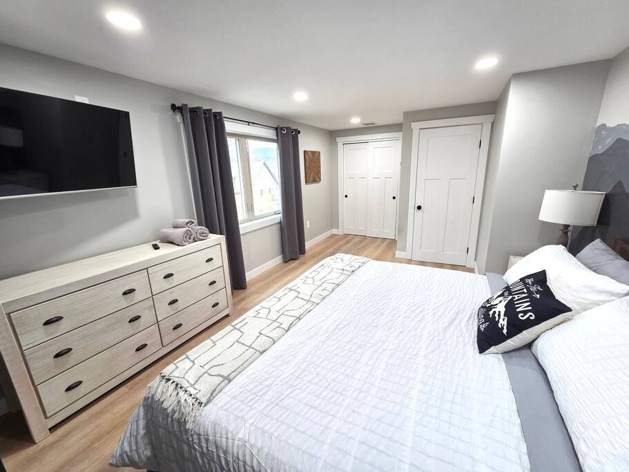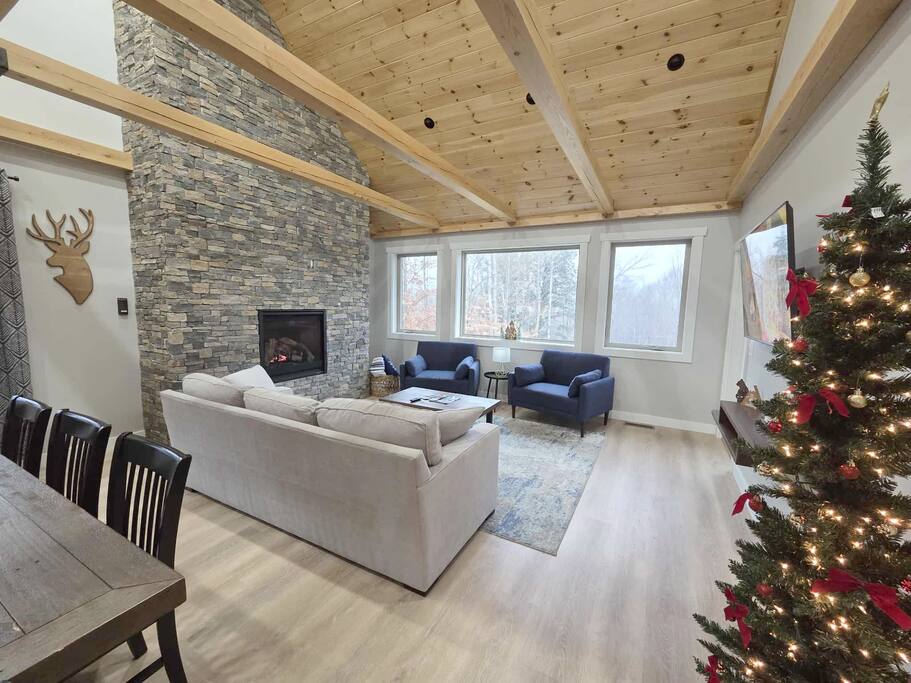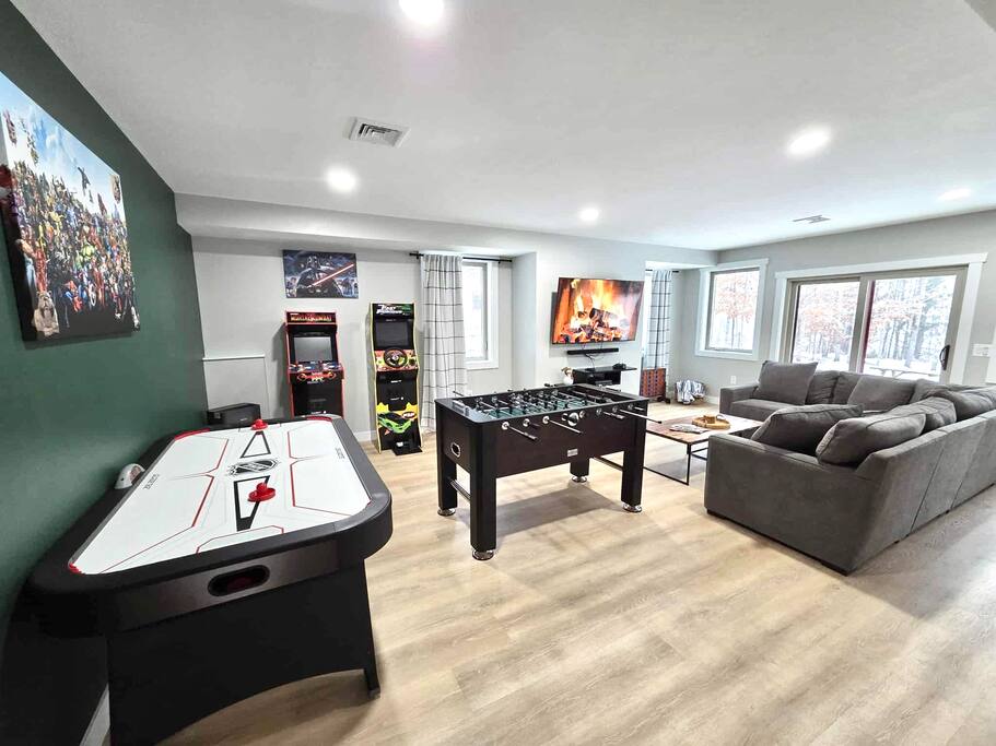 Step into this newly constructed home and find yourself transported into vacation mode instantly. It's flooded with natural light and designed with a touch of mountain charm. High ceilings, rustic details, and minimalist finishes give you the mental space you need to relax and restore. A large living room window frames a stunning mountain view that changes as the sun moves across the sky. This four bedroom White Mountain Retreat is ideal for large families or groups —providing places to hang together and unwind apart. The location is a paradise for adventurers: It is right next to Attitash and steps away from some of the area’s most peaceful and scenic hiking trails. Renters have access to the Attitash Sports Club, which includes a fitness center, indoor/outdoor pools and hot tubs, tennis courts, playgrounds, beach trails, and more! Plus, Storyland and North Conway Village are right up the street, making this luxury property a welcome home base for a truly memorable getaway. Featured Highlights * Access to Attitash Sports Club * Gas Fireplace * Hot Tub * Covered Porch with Seating * Fire Pit * Mountain Views * Playroom/Gameroom * Short Distance to Multiple Ski Resorts * 5 minutes to Storyland * Next door to Attitash MAIN FLOOR The first floor features a captivating great room, where the kitchen, dining area, and living room are united under the striking vaulted ceilings. This expansive space is ideal for groups to gather for shared meals and cherished moments. The dining area comfortably accommodates 8 at the table, with an additional 4 seats available on the island. In the living room, a couch centers around the stone fireplace that stretches to the ceiling, inviting guests to curl up for cozy afternoons or evenings after a day spent in the outdoors. It can also serve as the focal point for group gatherings and game nights. BEDROOMS 1st Floor Primary Bedroom | 1 king bed with en suite bath, walk-in closet, and walk-out to covered porch 2nd Floor Bedroom 1 | 1 queen bed, shared bathroom 2nd Floor Bedroom 2 | 2 sets of bunkbeds with 4 twin mattresses total, shared bathroom Lower Level Bedroom | 2 full beds and en suite bath with shower LOWER LEVEL On the lower level, discover a dedicated kids’ playroom, which is a fun hideaway for kids. Additionally, a spacious family room awaits, complete with comfortable seating, a TV, air hockey table, an assortment of board games, and convenient access to the hot tub. This area is designed for both entertainment and relaxation, making it a great spot for family and friends to have fun together. PARKING & STORAGE – Parking for 2 cars in the garage and 3 cars in the driveway – Ski storage rack in garage AMENITIES Outdoor - Access to Attitash Sports Club - Large yard with mountain views - Hot tub on covered patio - Fire pit w/ Adirondack chairs - Picnic table - Covered porch w/ furniture - Gas grill - Corn hole set Indoor - Smart TVs in every bedroom - Variety of bed sizes including 1 king bed, 1 queen bed, 2 full beds and 4 twins (bunks) - Bunk bed room - Full kitchen - Dining area - Gas fireplace - Wireless internet - Remote workspace with door - Washer and dryer - Playroom/Game Room: Fort building cushions, air hockey, foosball, board games and more! xSTR DETAILS & SUPPLIES We go the xSTR mile to make your stay easy and memorable. We provide: - Bedding: Bed Linens, bath towels, and hot tub/pool towels - Toiletries: shampoo, conditioner, body wash, and cotton swabs in each bathroom - Kitchen supplies: pots & pans, dinnerware, bakeware, plasticware for children, toaster, blender, dual coffee maker (K-cup and drip), glassware, food storage containers, wine glasses, and more! - Paper goods: paper towels, toilet paper, dishwasher tablets, laundry pods, and trash bags - Coffee/Tea: A few starter supplies for coffee and tea. ATTITASH MOUNTAIN We're just a mile from Attitash Mountain. There's free parking at the base of the mountain and across the street, so you can park and walk to the slopes. If parking across the street, be sure to use the underground walkway to safely cross the road. There's overflow parking further down the street with a shuttle every 5-10 minutes. SPORTS CLUB AMENITIES All renters will have access to Attitash Sports Club amenities including indoor/outdoor pools, indoor/outdoor hot tubs, tennis courts, playgrounds, private walking trails to small beaches along the Saco, game rooms, fitness rooms, and more. Access is free for our guests. A keycard is provided at the property. Lost keycards are subject to a $25 replacement fee. Please review the welcome book for additional information. - Indoor & Outdoor Pools - Indoor & Outdoor Hot Tubs - Saunas - Tennis Courts (clay and hard surface) - Walking Trails - Beaches along the Saco River - Fitness Rooms - Game Rooms